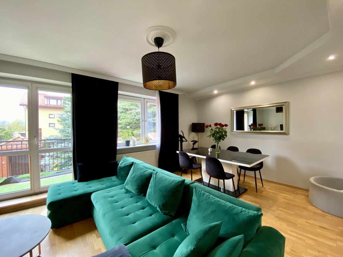 przestronny salon z wyjściem na balkon,