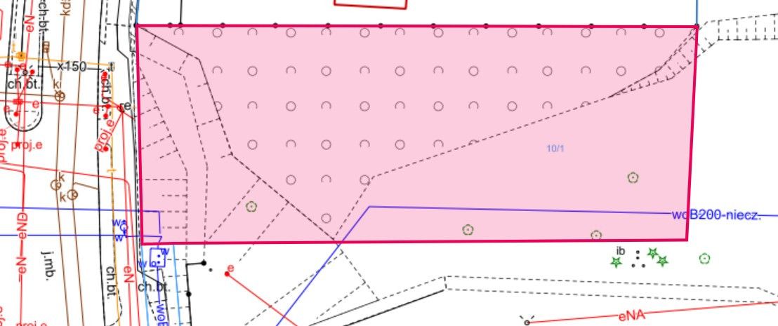Działka ma regularny kształt prostokąta o wymiarach ok. 27m x 68m, co umożliwia efektywne zaprojektowanie zabudowy usługowej wraz z parkingiem i zielenią.