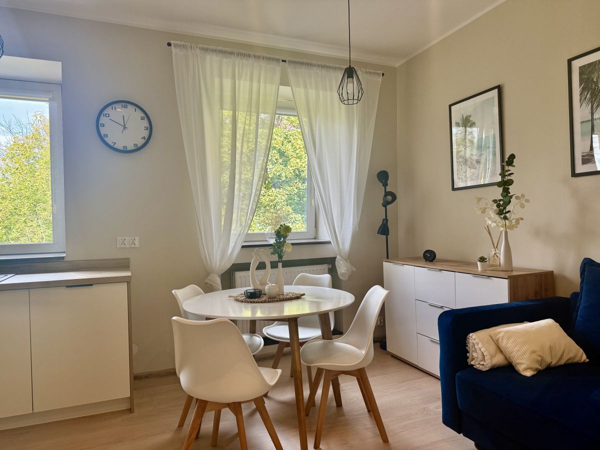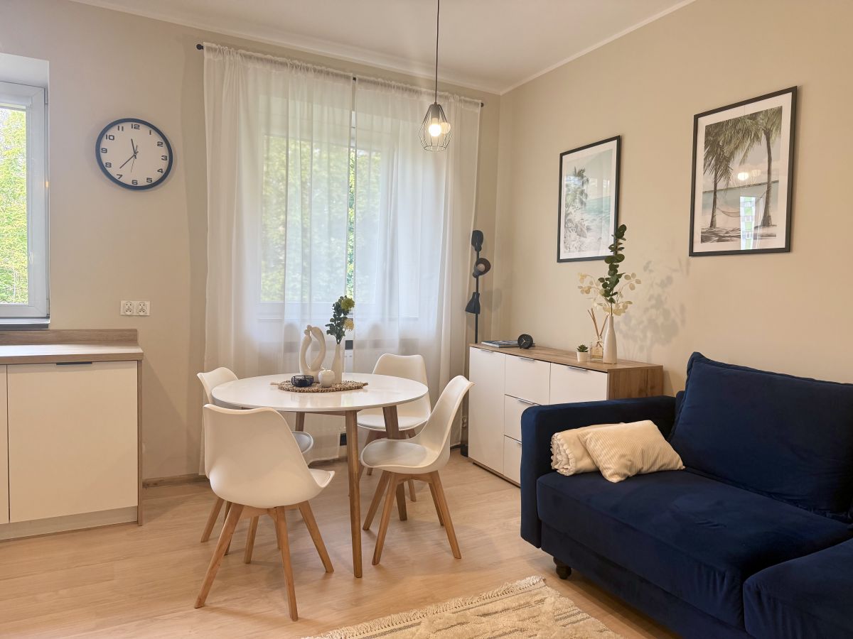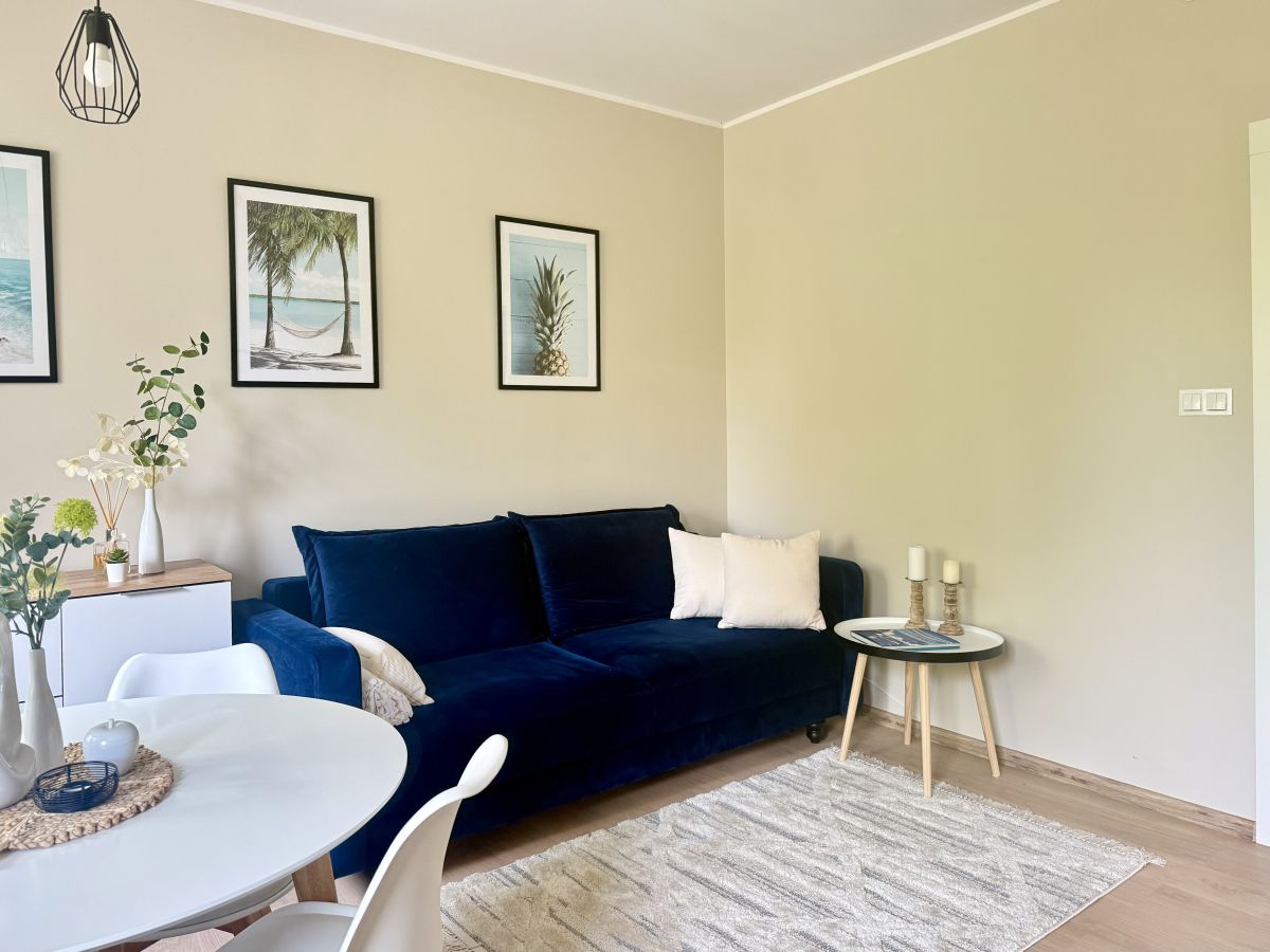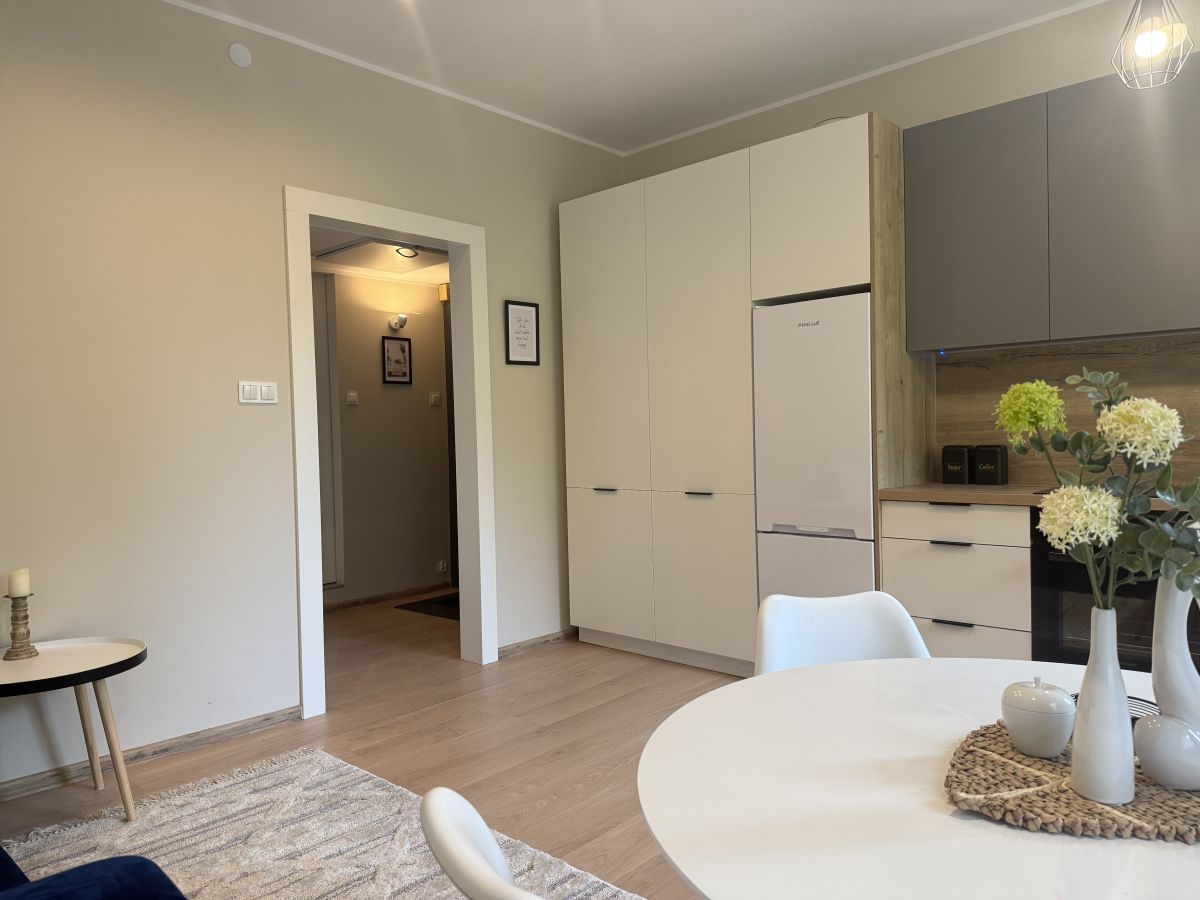 Mieszkanie zostało urządzone nowocześnie z dużą dbałością o detale. Znajdziesz tu liczne meble wykonane na wymiar, co pozwala zachować spójność wnętrza i oferuje dużo przestrzeni do przechowywania. Kuchnia wyposażona jest w zlewozmywak, zmywarkę, płytę indukcyjną, piekarnik i chłodziarko-zamrażarkę. Salon zdobi wygodna sofa z funkcją spania.
