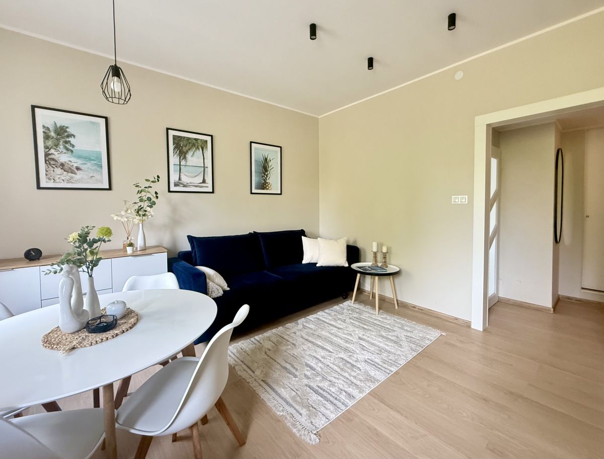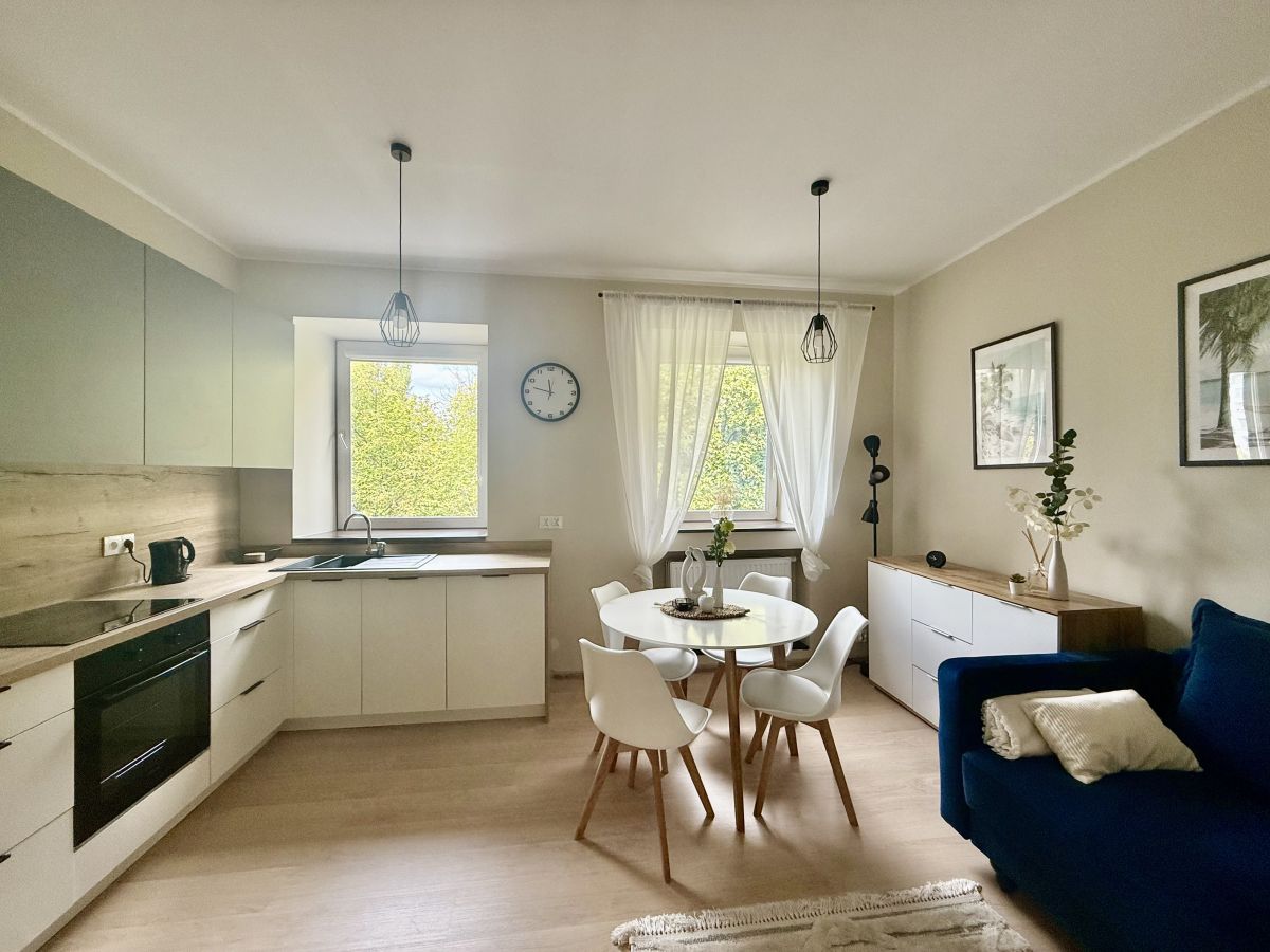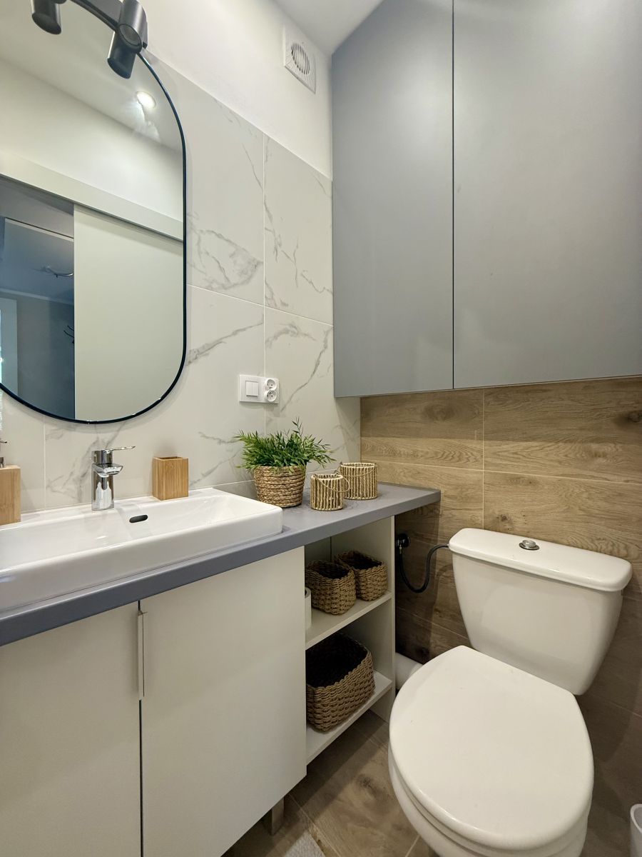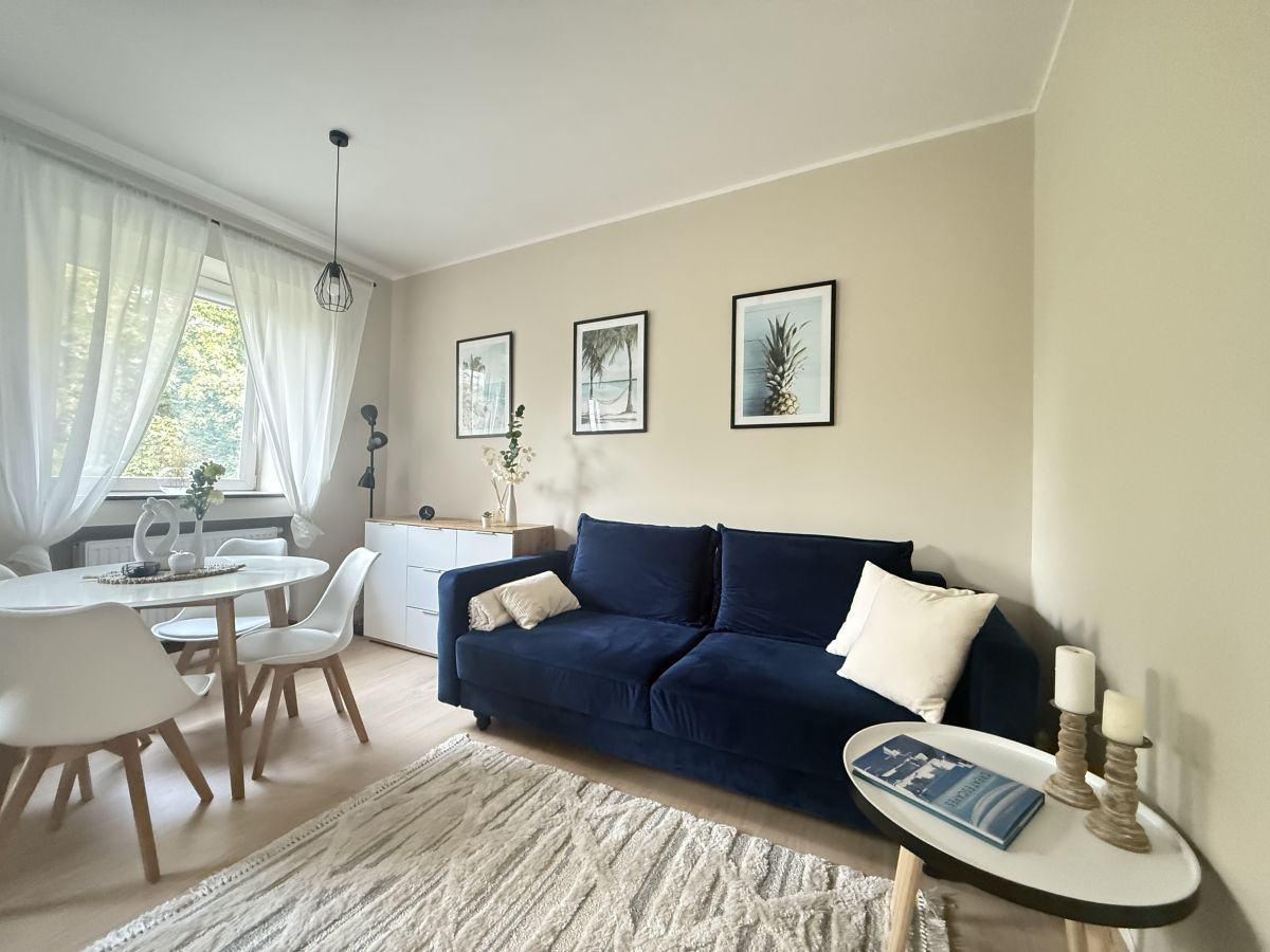 Mieszkanie zostało urządzone nowocześnie z dużą dbałością o detale. Znajdziesz tu liczne meble wykonane na wymiar, co pozwala zachować spójność wnętrza i oferuje dużo przestrzeni do przechowywania. Kuchnia wyposażona jest w zlewozmywak, zmywarkę, płytę indukcyjną, piekarnik i chłodziarko-zamrażarkę. Salon zdobi wygodna sofa z funkcją spania.