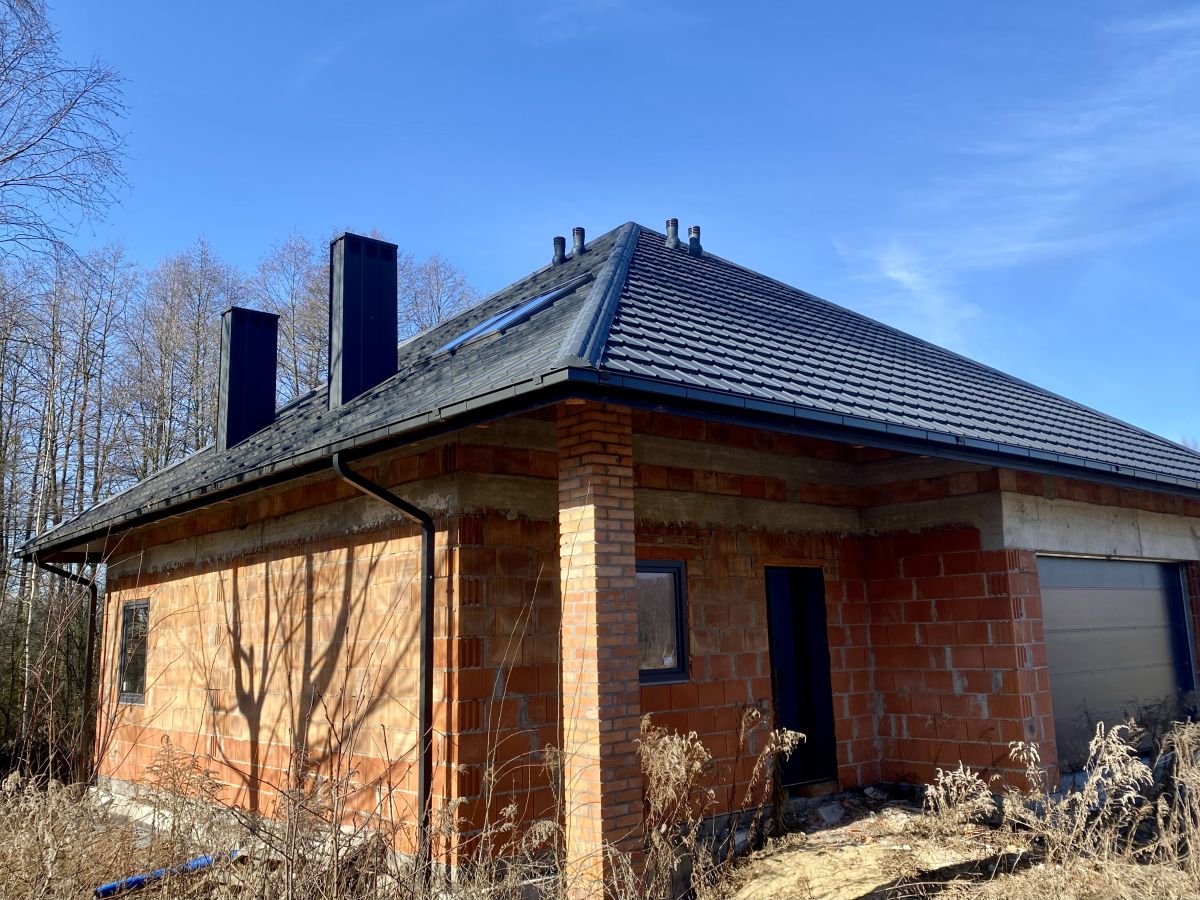 - Dach: blachodachówka, pełne orynnowanie, kominy wentylacyjne