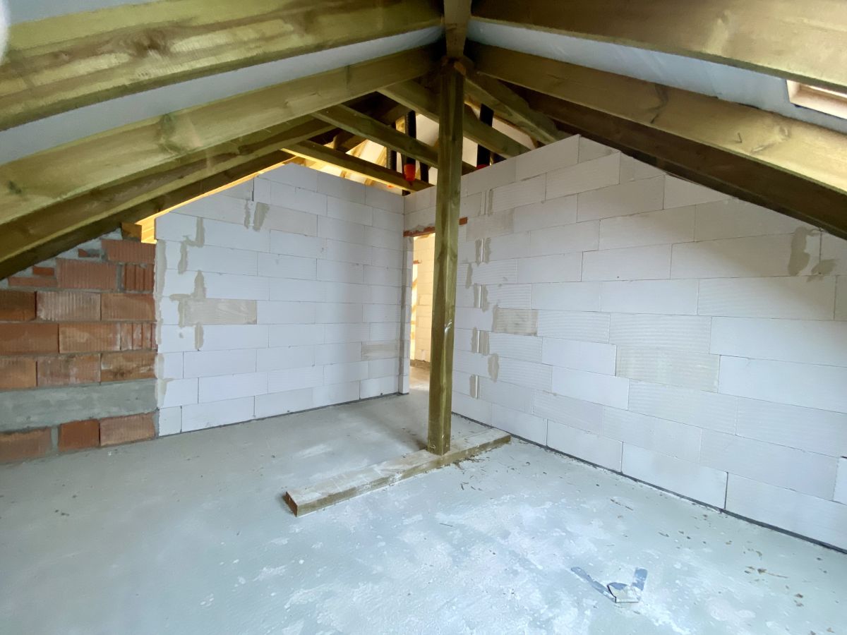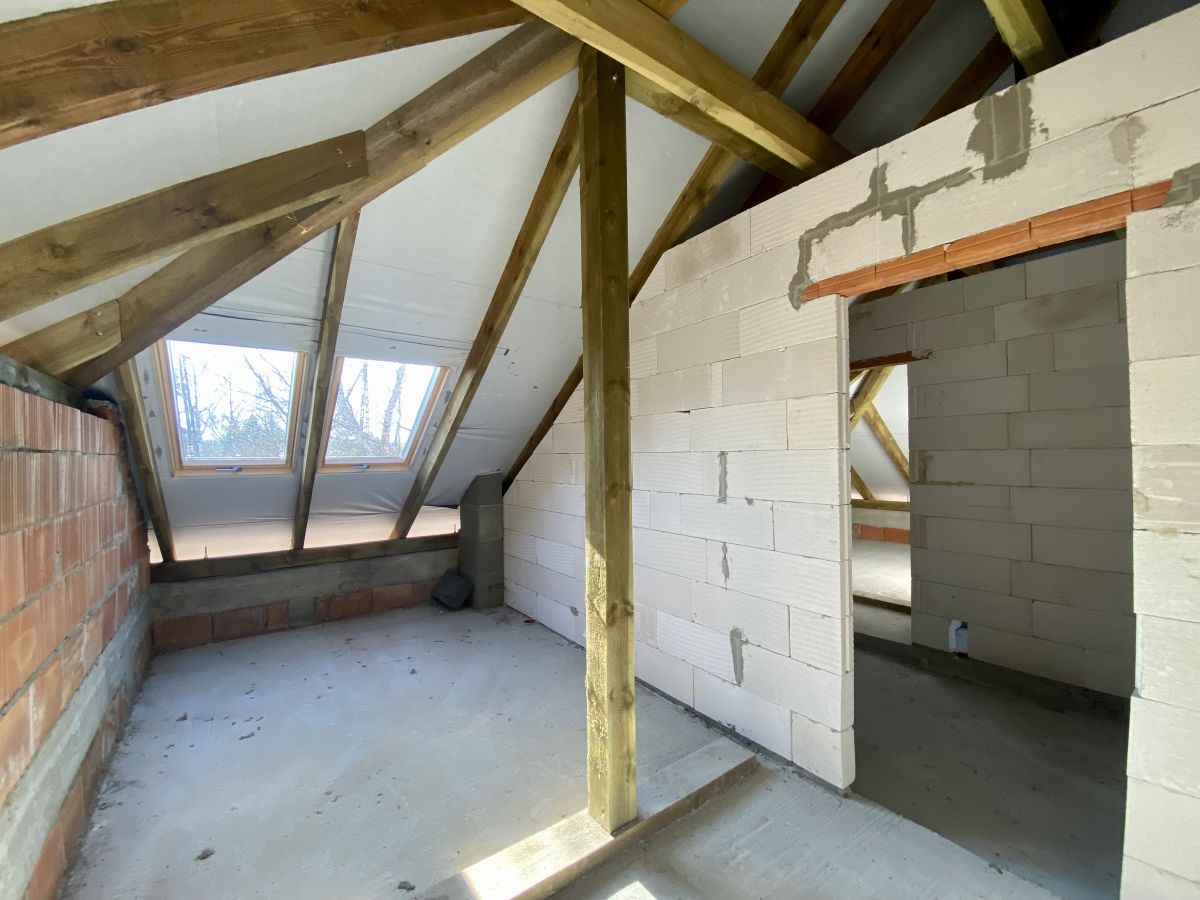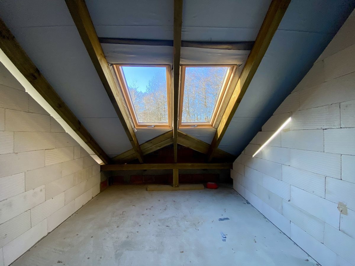 Tradycyjna gruba więźba dachowa, układ pomieszczeń idealny do montaży pompy ciepła - jednostka zewnętrzna z dala od pomieszczeń sypialnych, zabieg schodów nie zabierający miejsca w korytarzu, Brama garażowa o dobrych parametrach cieplnych wraz z napędem marki SOMFY, mała odległość budynku do przyłączy zmniejszająca koszty ich wykonania, instalacja przewodów wentylacyjnych, drzwi antywłamaniowe o dobrych parametrach cieplnych i akustycznych, wymurowany komin przygotowany do montażu kominka, nowoczesne okna połaciowe z łatwym dostępem do klamek, poprzez przemyślane rozmieszczenie pomieszczeń do wykonania tylko 1 pion wod-kan.