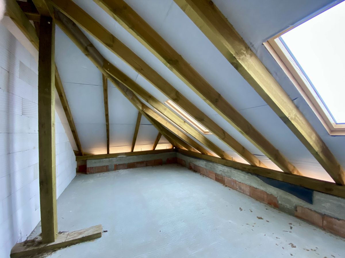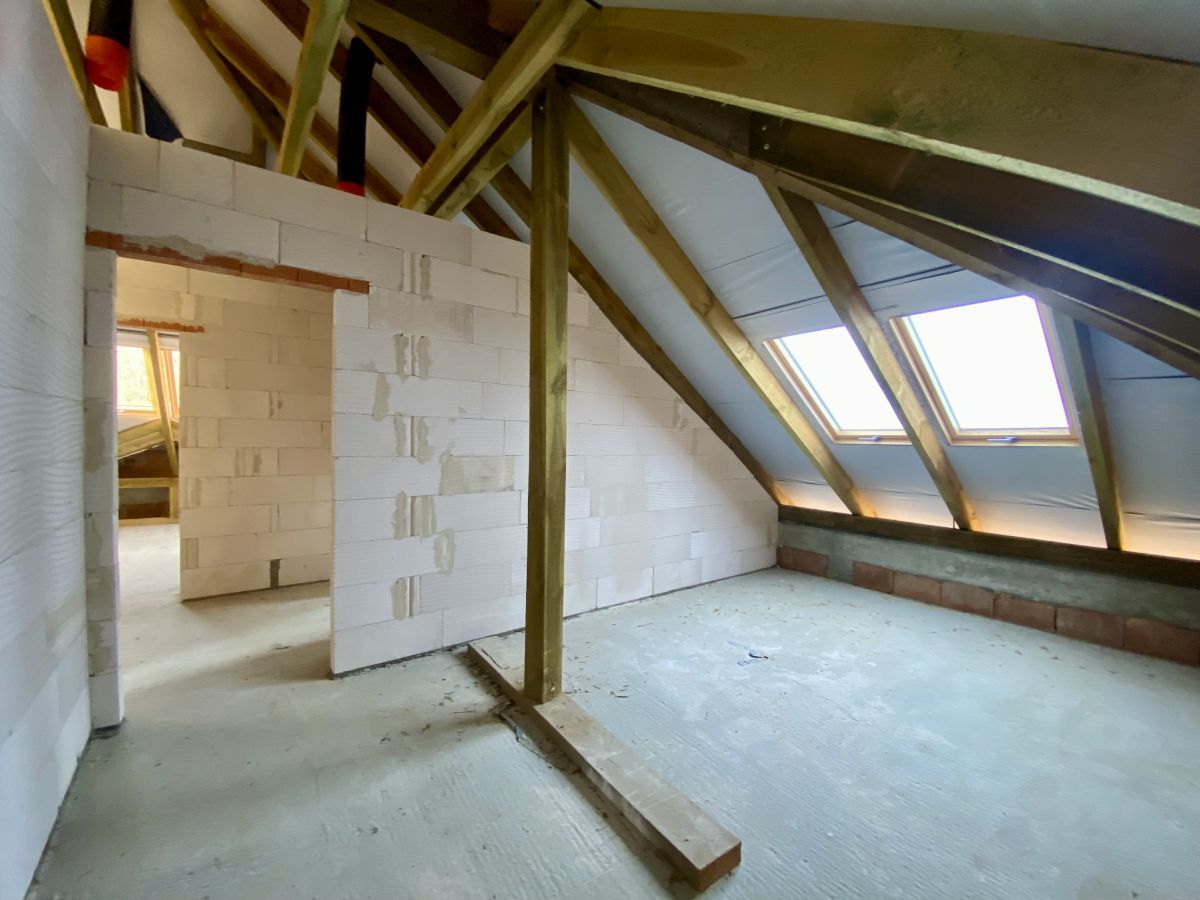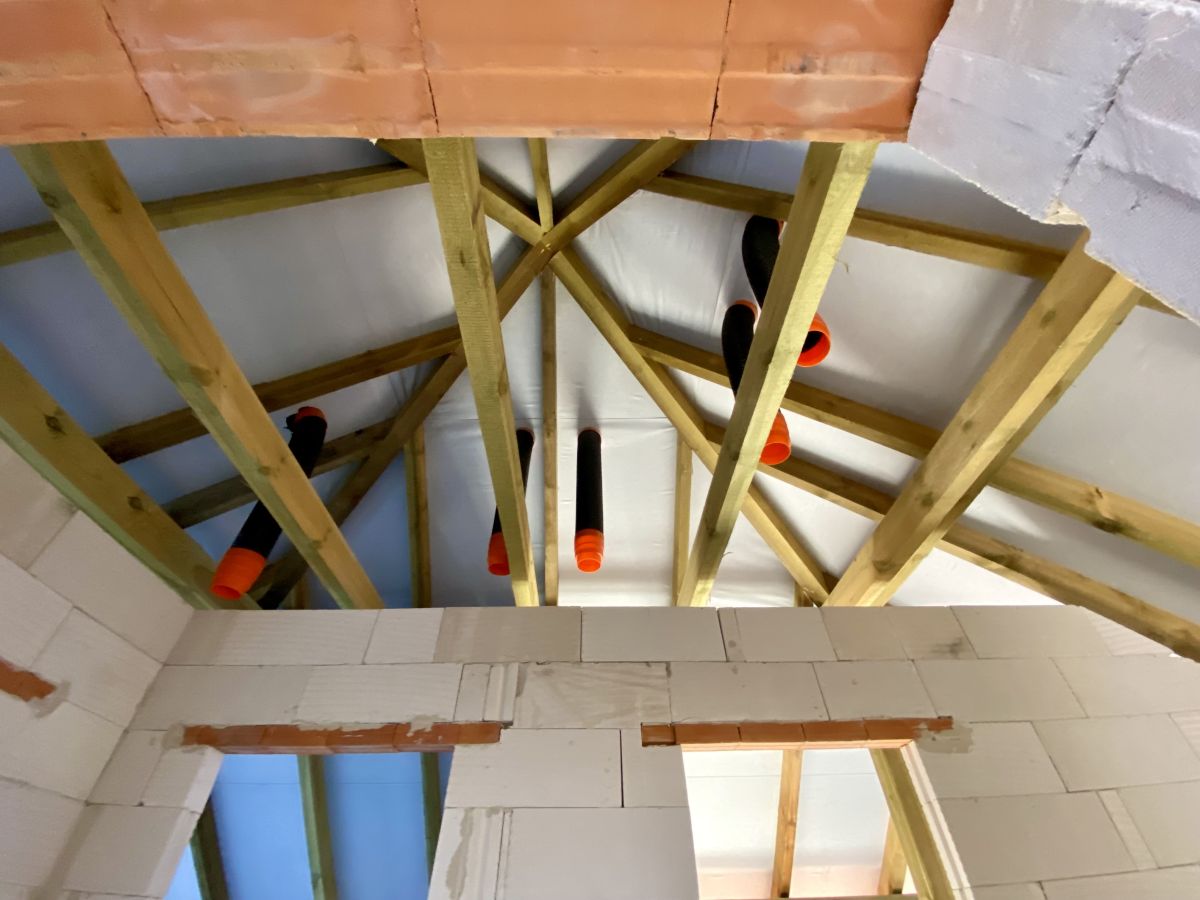 Tradycyjna gruba więźba dachowa, układ pomieszczeń idealny do montaży pompy ciepła - jednostka zewnętrzna z dala od pomieszczeń sypialnych, zabieg schodów nie zabierający miejsca w korytarzu, Brama garażowa o dobrych parametrach cieplnych wraz z napędem marki SOMFY, mała odległość budynku do przyłączy zmniejszająca koszty ich wykonania, instalacja przewodów wentylacyjnych, drzwi antywłamaniowe o dobrych parametrach cieplnych i akustycznych, wymurowany komin przygotowany do montażu kominka, nowoczesne okna połaciowe z łatwym dostępem do klamek, poprzez przemyślane rozmieszczenie pomieszczeń do wykonania tylko 1 pion wod-kan.